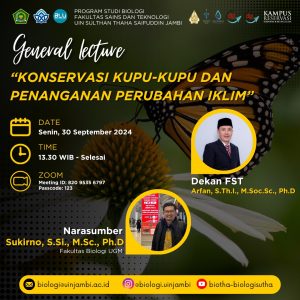Program Studi Biologi FST UIN Sulthan Thaha Saifuddin Jambi sukses menyelenggarakan Kuliah Umum Dengan Tema “Konservasi Kupu-Kupu dan Penanganan Perubahan Iklim” yang dilakukan secara hybrid (luring dan daring) pada (30/09/24) di ruang Rapat FST dan via zoom meeting. Kuliah umum yang dilakukan mengundang narasumber dari Program Studi Biologi Fakultas Biologi Universitas Gadjah Mada (Sukirno, S.Si., M.Sc., Ph.D). Beliau juga merupakan Ketua Program Sarjana Program Studi Biologi.