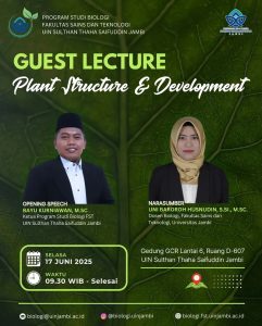 Program Studi Biologi Fakultas Sains dan Teknologi UIN Sulthan Thaha Saifuddin Jambi menyelenggarakan kegiatan Guest Lecture Mata Kuliah Struktur Perkembangan Tumbuhan pada Selasa, 17 Juni 2025, bertempat di Ruang Kuliah GCR Lantai 6, Ruang D-607, mulai pukul 09.30 WIB hingga selesai.